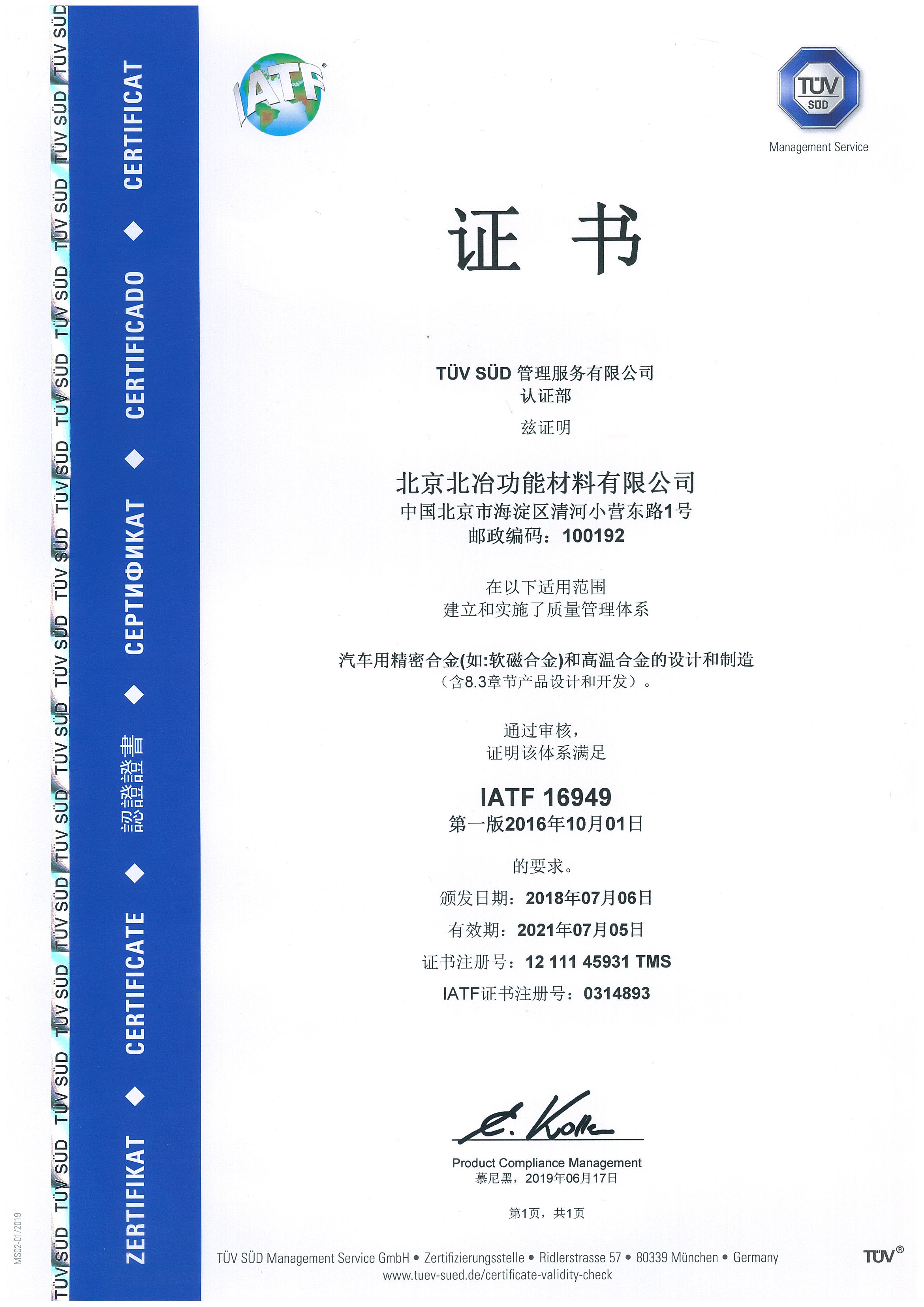 IATF16949認證證書(中文)2019